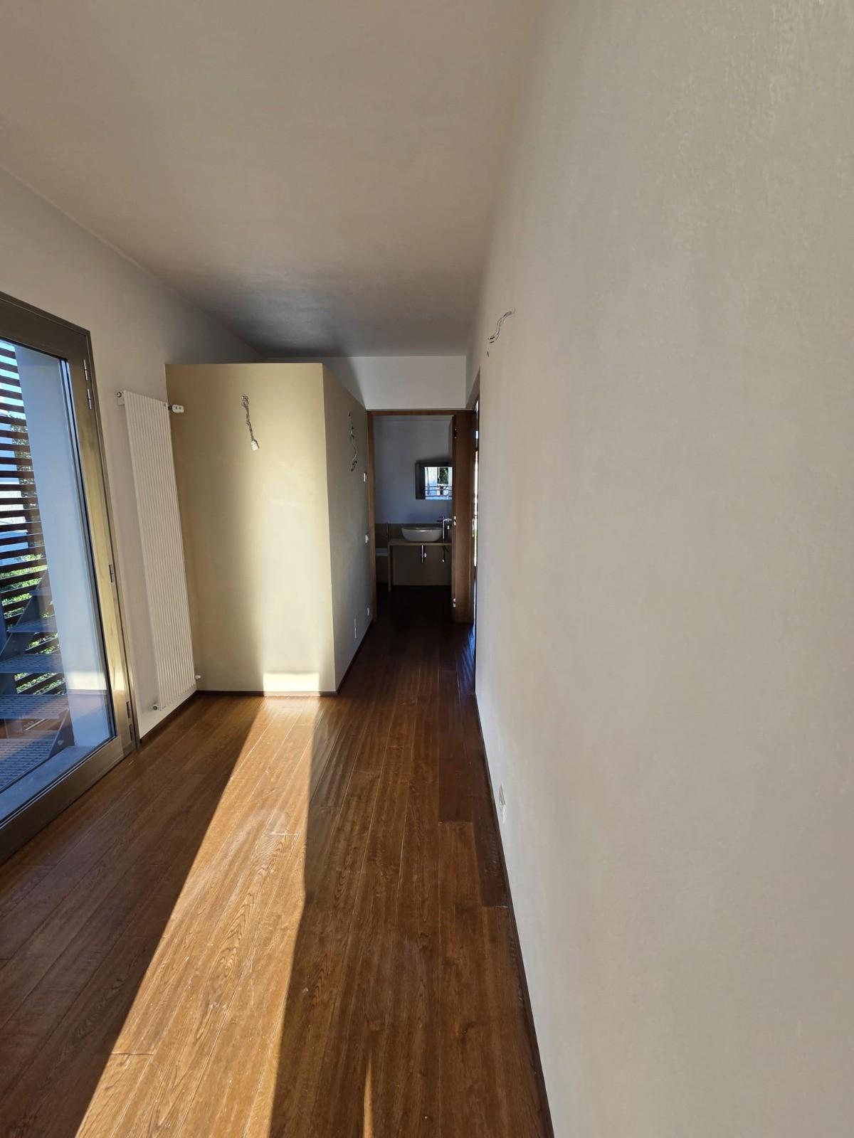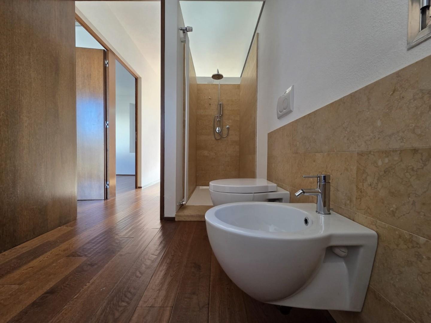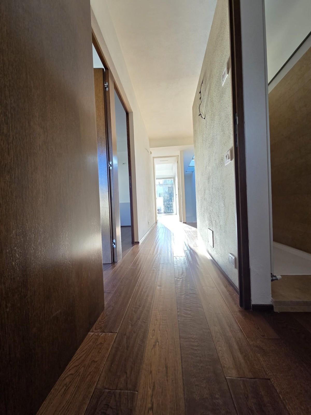 Il primo piano è interamente contraddistinto da una pavimentazione in listelloni di quercia, che dona calore ed eleganza all’ambiente. Qui si trovano tre camere luminose e due bagni, entrambi rifiniti con materiali di pregio.
