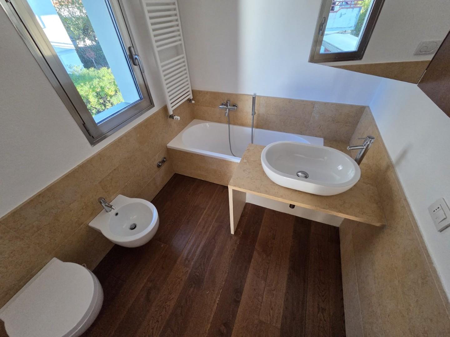 Tutti i bagni sono rivestiti in pietra, mentre le terrazze – due al piano terra e una al primo piano – sono rifinite con doghe in legno lamellare marino, lo stesso materiale utilizzato per i cancelli automatici d’ingresso, a conferma di una cura maniacale dei dettagli.