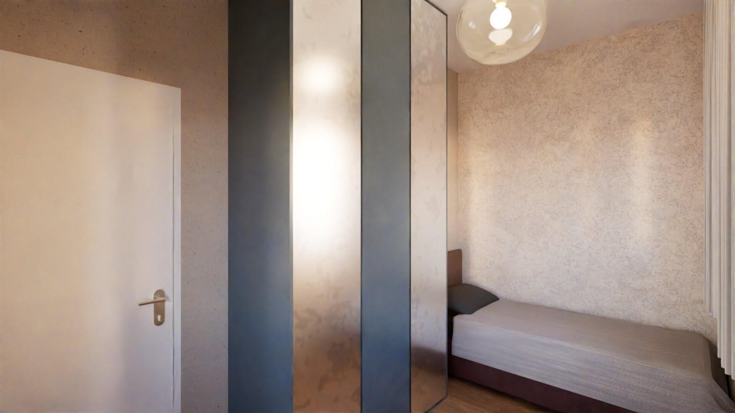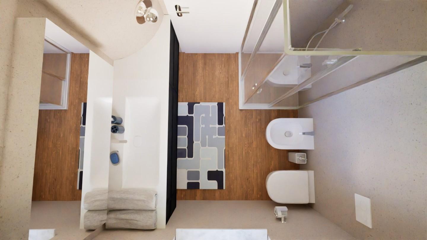 Troviamo inoltre una terza stanza, ideale come cabina armadio o studio ?, anch’essa dotata di un proprio terrazzo, e un bagno finestrato con doccia ?.