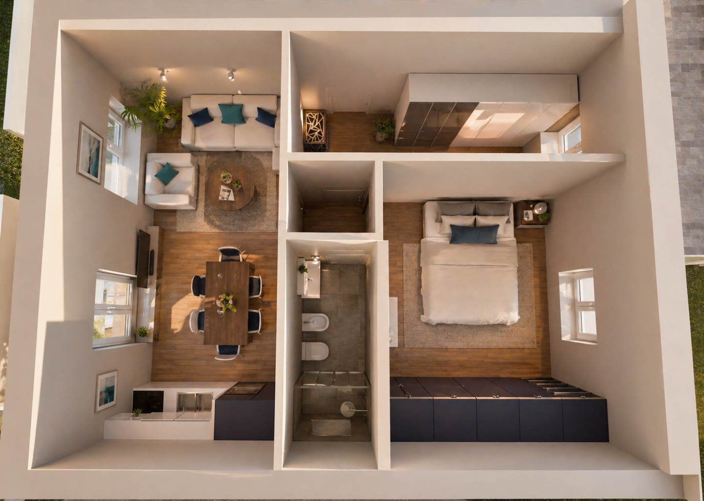 Per alcune tipologie (piano terra e piano secondo) è inoltre prevista la possibilità di realizzare un soppalco ad uso accessorio, ideale come camerina o cabina armadi.