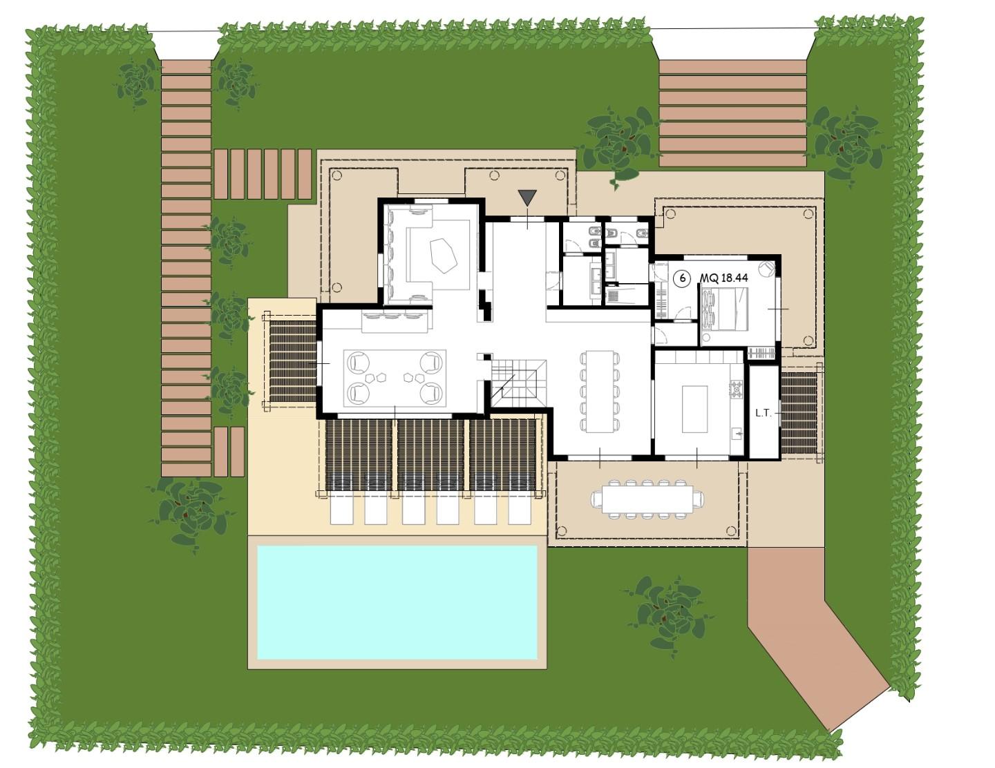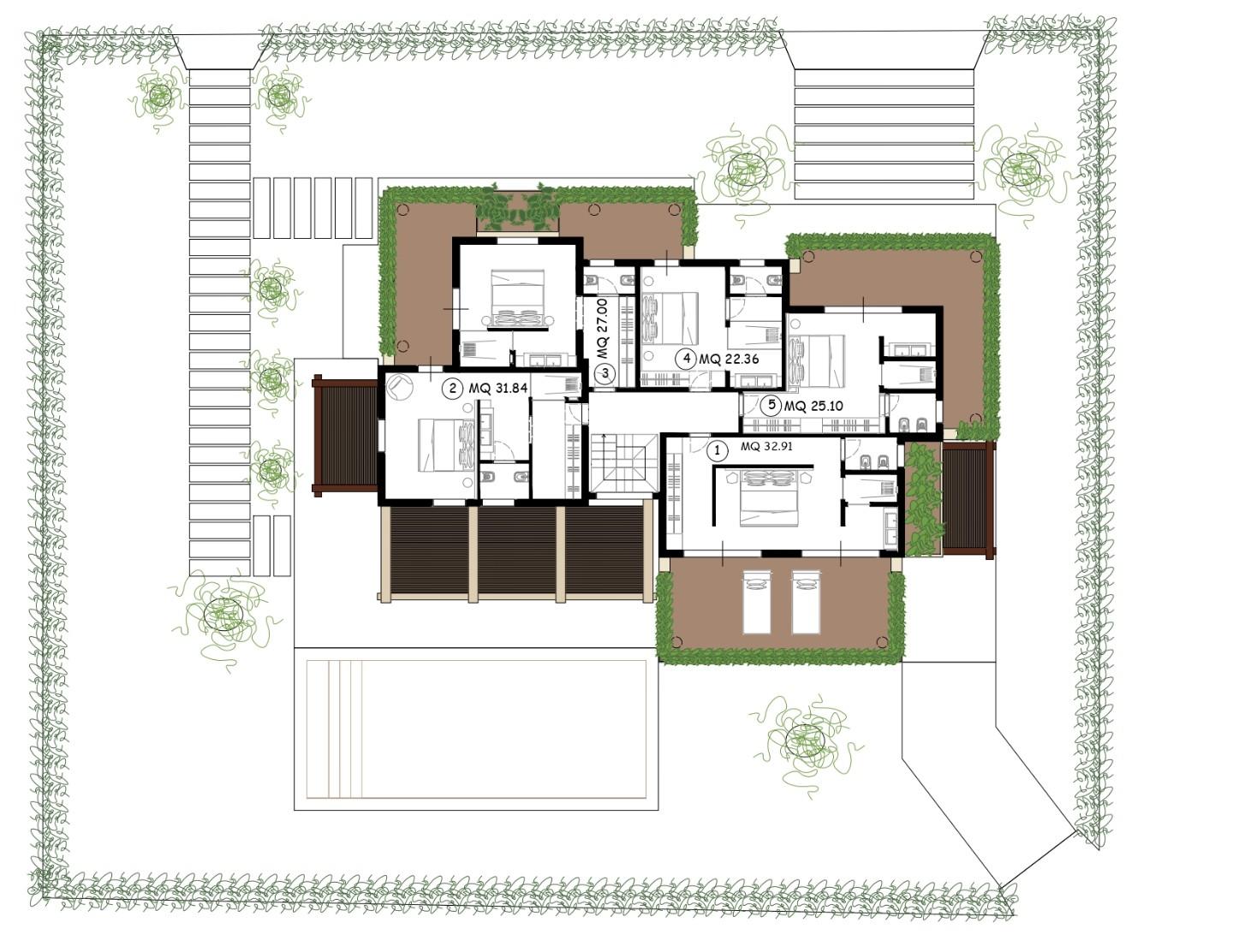 Al piano terra troverà spazio una prima camera da letto con bagno privato, oltre alle principali aree dedicate al soggiorno, alla zona pranzo e alla cucina e bagno di servizio. Il piano superiore ospiterà ulteriori cinque camere da letto, tutte progettate per garantire massimo comfort e privacy. Complessivamente la villa disporrà di sei camere da letto, ciascuna con bagno privato, cabina armadi e balcone.